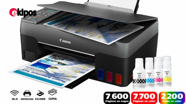 La impresora inalámbrica multifuncional de tanque recargable PIXMA G3160 de Canon está diseñada para aumentar la productividad y ofrece impresiones de alto volumen y de bajo costo, como también una excelente capacidad de mantenimiento y uso. Su sistema de tinta de tanque recargable imprime hasta 7,600 páginas en negro/7,700 páginas en color con un juego de botellas de tinta1. Imprima, copie y escanee con facilidad y disfrute de una gran versatilidad. Imprima documentos, fotografías sin bordes3 y mucho más en una variedad de tipos y tamaños de materiales con tintas híbridas para obtener negros nítidos y colores vivos. Además, puede imprimir a donde vaya de forma inalámbrica desde sus dispositivos móviles favoritos2. Imprima más por menos con la impresora multifuncional inalámbrica de tanque recargable PIXMA G3160 de Canon.